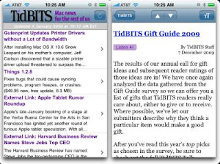 文: Adam C. Engst 新年にあたり、iPhone と iPod touch 用の無料のアプリ、TidBITS News をご紹介させて頂きたい。iPhone OS ソフトウェア開発という素晴らしき新世界に私たちが初めて公式に進出することとなるこのアプリは、真の意味でのチーム協力の産物だった。(料理人が多過ぎると単純なアプリでさえもいつまで経っても出来上がらないという格言があるが、今回はまさにその裏返しだった。)Matt Neuburg が Cocoa コードを一手に引き受け、Glenn Fleishman が特製の舞台裏専用 RSS フィードを作り上げ、Jeff Carlson がアイコンを担当し、他のスタッフたちが援助と情報とを提供した。(「口うるさくガヤガヤ言う」の裏返しだった。)そして 出来上がったアプリが今、App Store からダウンロードできるようになっている。さっき言ったように、無料だ。 TidBITS News アプリの初めてのバージョンで今回私たちが目指したのは、最新の TidBITS 記事のフルテキストにアクセスできるシンプルかつエレガントなアプリを作る一方で、iPhone OS プラットフォームにおけるエレガントな使用法の利点をフルに引き出したいということだった。 その目標のために、TidBITS News アプリにはたった2つのスクリーンしかない。最初のスクリーンで、最も新しい記事 60 個の見出しと要約が表示される。この見出しスクリーンでどれかの項目をタップすれば、第2のスクリーンが現われ、そこでその記事のテキストすべてが読める。 記事表示スクリーンの上で、記事の中に含まれているリンクをタップすれば、それに対応するウェブページが Safari で開く。記事のタイトルをタップすれば、対応する TidBITS ウェブページがロードされる。ただし、もしもその項目が外部リンク記事だった場合には、その外部リンク参照先の元記事がロードされる。もしも記事の中に YouTube ビデオが埋め込まれていれば、タップしてムービーを観ることができるし、Done をクリックすれば元の記事に戻る。私たちがポッドキャストとして録音済みの記事については、上の方にある Listen ボタンをタップすれば私たちのウェブサイトからストリーミングオーディオとしてその録音が聴ける。 今の段落で説明したことはすべて、当然ながらアクティブなインターネット接続を必要とする。けれどもこの TidBITS News アプリはインターネット接続なしの状態でも使える。なぜなら、記事自体はあなたの iPhone や iPod touch の中にキャッシュされるからだ。だから、例えばあなたが朝起きてこのアプリを起動させれば、自動的に最新の記事がキャッシュ保存されるので、その後アプリを終了させてよい。それから後になってまたアプリを起動させれば、たとえその時オフラインであっても通勤中の地下鉄の中で面白そうな記事を読むことができるし、iPod touch が Wi-Fi ネットワークの外にあっても問題ない。 このアプリにはボタンが3つしかない。1つは最初のスクリーンにある Refresh ボタンだ。これを押せばアプリがインターネットに出て行って記事のキャッシュをアップデートする。キャッシュはアプリを起動した際に自動的にアップデートされるが、あなたがアプリを終了した際には見出しスクリーンが開いていた場合のみキャッシュがアップデートされる。何か記事を読んでいる最中にアプリを終了した場合は、次にアプリを起動した時に、もちろんその同じスクリーンが開いたままの状態に戻って同じ記事を読み続けられるだけでなく、キャッシュの自動アップデートは行なわれない。そこで、手動でキャッシュをアップデートする方法が必要となる。そのためにあるのが Refresh ボタンだ。このボタンをタップすれば、まずボタンが無効化される。必要以上にユーザーが RSS フィードを連打することを避けたいからだ。アプリのラン1回につきリフレッシュは1回で十分だろう。 第2のボタンは記事表示スクリーンにあり、記事のフォントサイズを指定する。これをタップすれば5種類のフォントサイズが循環して切り替わる。一番大きなサイズの後でもう1回タップすれば一番小さなサイズに戻る。こうして、あなたの目に一番合ったサイズのところで止まればよい。第3のボタンも記事表示スクリーンにあり、上と下の矢印を示している。これをタップすれば、前の記事や次の記事が表示される。いちいち見出しスクリーンに戻る必要はない。 このアプリにはそれ以外にボタンはなく、それ以外にオプションはない。意図的にそういう風にデザインしてあるのだ。私たちは、できるだけ物事をシンプルにしておきたいと思ったし、iPhone の小さな画面上の貴重なスペースを無駄に使いたくないと考えた。結局のところ、これはテキストを読むためのアプリなので、画面の中にできるだけたくさんのテキストが収まるようにしたかった。それぞれのスクリーンでボタンの数を1つか2つだけに抑えることによって、ボタンを上部のナビゲーションバーの中に置くことができ、スクリーンのそれ以外の部分をコンテンツを読むことに振り